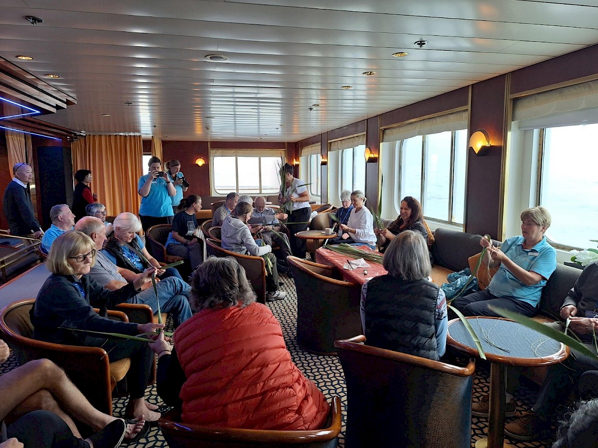 On 5 February, as a part of the ship’s programme, the Ngai Tahu MKTT Team were given permission by the Department of Conservation to collect harakeke (New Zealand flax – Phormium tenax)) in the vicinity of Hardwicke on Enderby Island to enable a morning of waiata and weaving instruction for a number of the ship’s passengers on 6 February, to commemorate Waitangi Day onboard the vessel.