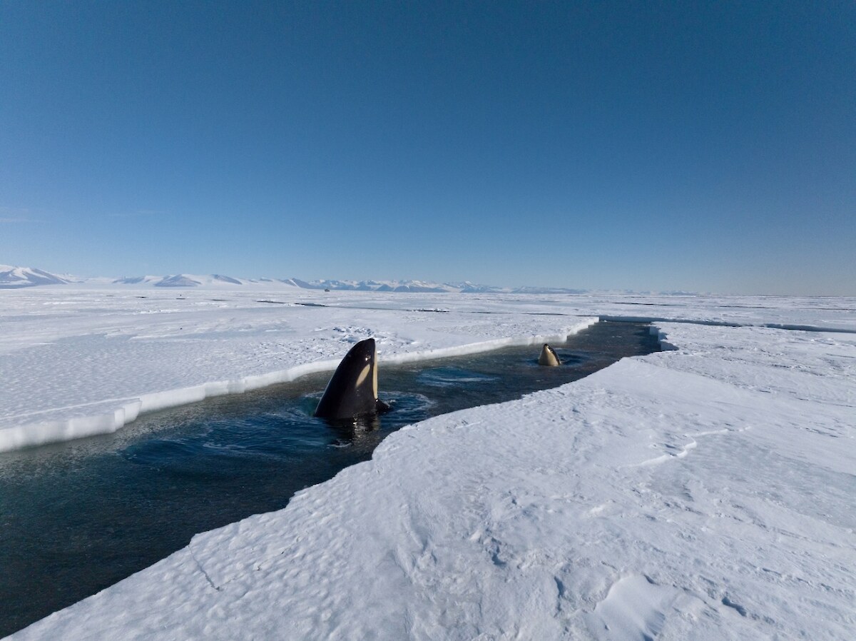 Orca “sky hopping” along a crack in the Ross Ice Shelf. Photo Credit C. Aitchison, Skyworks UAS